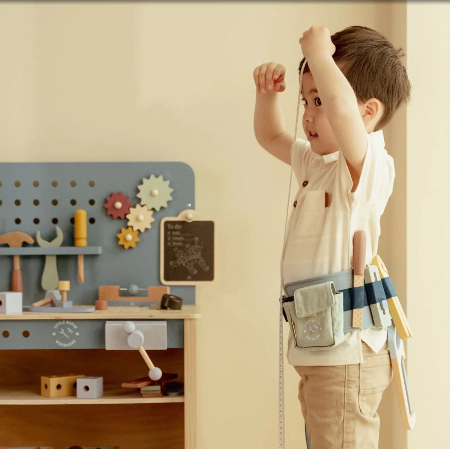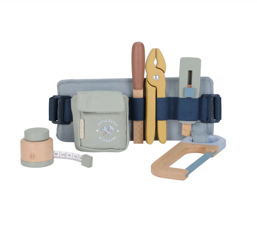 Stillanlegt smíðabelti ásamt verkfærum eins og hamri, skrúfjárni og skiptilykli. Fullkomið til hlutverkaleikja og til að þjálfa fínhreyfingar.
